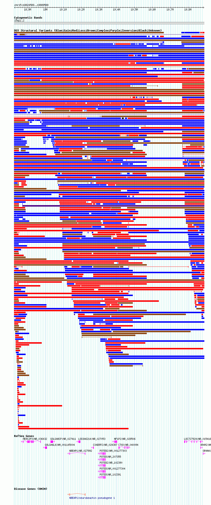 Variant DetailsVariant: nsv1047058| Internal ID | 19136277 | | Landmark | | | Location Information | | | Cytoband | 15q11.1 | | Allele length | | Assembly | Allele length | | hg38 | 1740952 | | hg19 | 1823650 | | hg18 | 1065000 |
