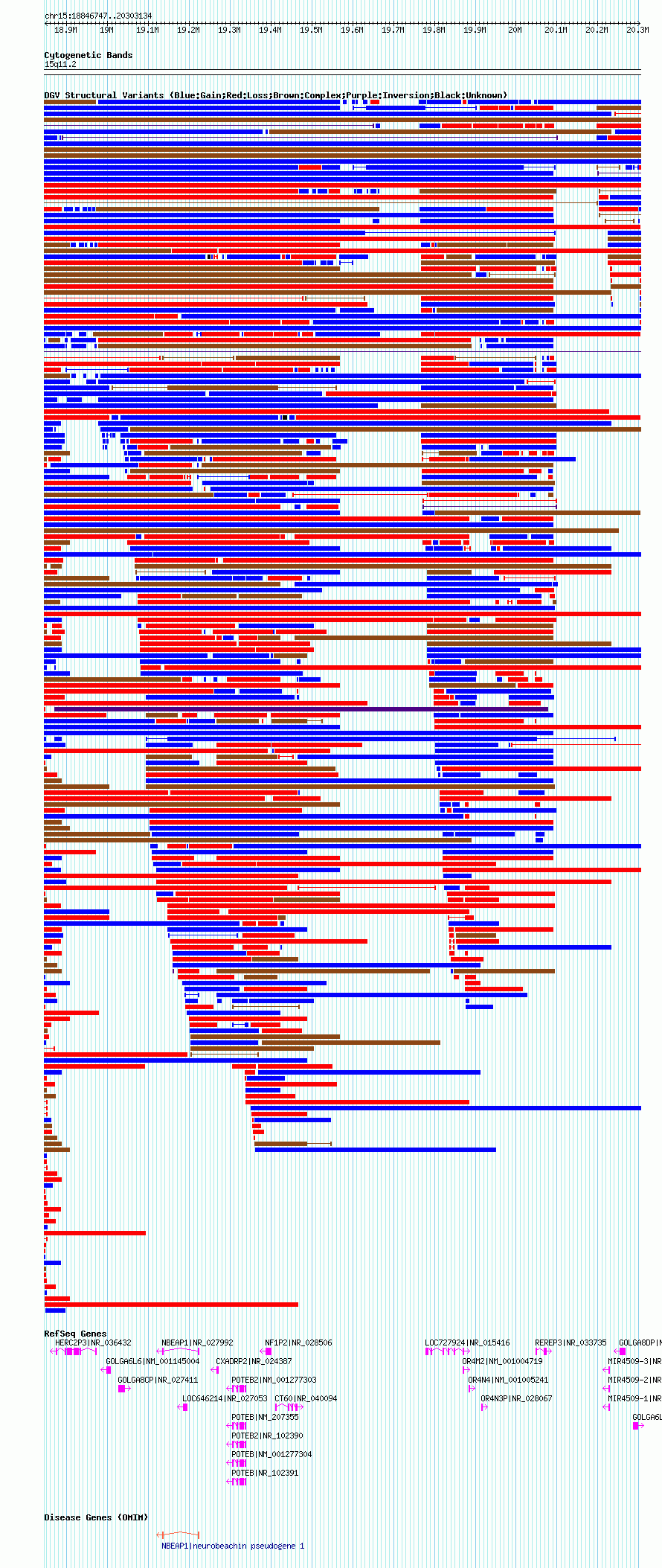Variant DetailsVariant: nsv1047063| Internal ID | 19136282 | | Landmark | | | Location Information | | | Cytoband | 15q11.1 | | Allele length | | Assembly | Allele length | | hg38 | 2091079 | | hg19 | 2165038 | | hg18 | 1456388 |