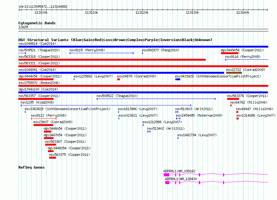 Variant DetailsVariant: nsv1047076| Internal ID | 19136295 | | Landmark | | | Location Information | | | Cytoband | 13q34 | | Allele length | | Assembly | Allele length | | hg38 | 49421 | | hg19 | 49421 | | hg18 | 49421 |