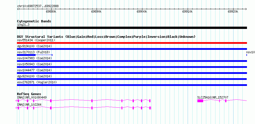 Variant DetailsVariant: nsv1047078| Internal ID | 19136297 | | Landmark | | | Location Information | | | Cytoband | 10q21.3 | | Allele length | | Assembly | Allele length | | hg38 | 50352 | | hg19 | 50352 | | hg18 | 50352 |