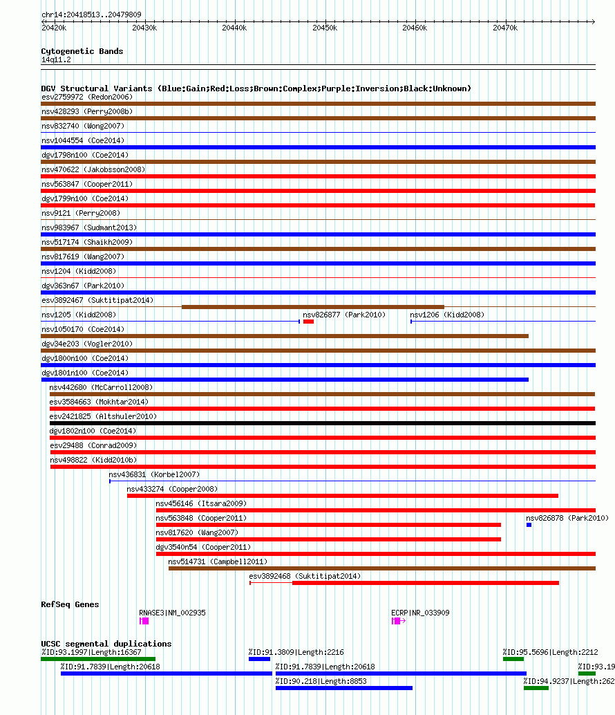 | Variant Type | CNV gain+loss | Copy Number | | Allele State | | Allele Origin | | Probe Count | | Validation Flag | | Merged Status | M | Merged Variants | dgv1798n100 | Supporting Variants | nssv3712138, nssv3530737, nssv3530744, nssv3712134, nssv3530743, nssv3530747, nssv3530746, nssv3530738, nssv3712135, nssv3712136, nssv3530740, nssv3530739, nssv3530745, nssv3530741, nssv3712137, nssv3530742 | Samples | | Known Genes | ECRP, RNASE3 | Method | SNP array | Analysis | Affymetrix SNP array copy number analysis | Platform | Affymetrix SNP Array 6.0 | Comments | | Reference | Coe_et_al_2014 | Pubmed ID | 25217958 | Accession Number(s) | nsv1047105