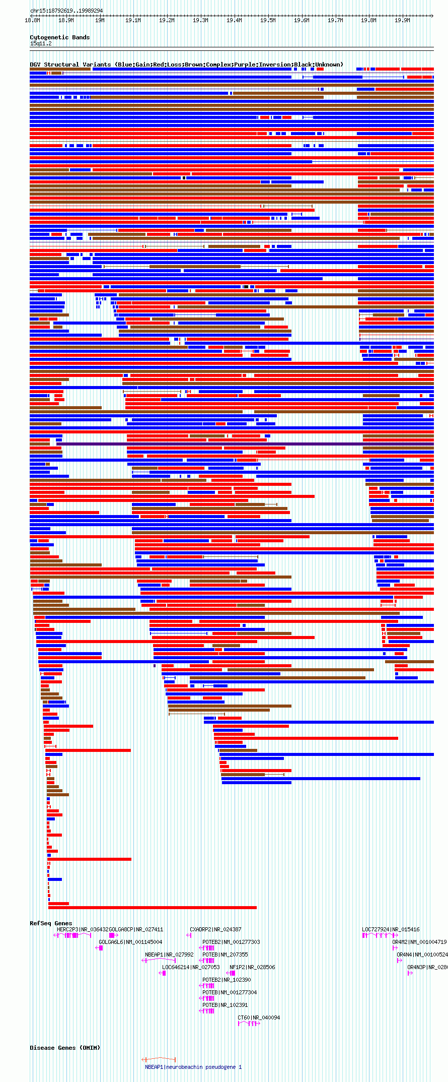 Variant DetailsVariant: nsv1047119| Internal ID | 19136338 | | Landmark | | | Location Information | | | Cytoband | 15q11.1 | | Allele length | | Assembly | Allele length | | hg38 | 1872628 | | hg19 | 1955326 | | hg18 | 1196676 |