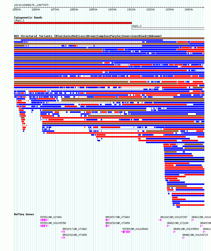Variant DetailsVariant: nsv1047279| Internal ID | 19136498 | | Landmark | | | Location Information | | | Cytoband | 14q11.1 | | Allele length | | Assembly | Allele length | | hg38 | 1299770 | | hg19 | 991452 | | hg18 | 991292 |