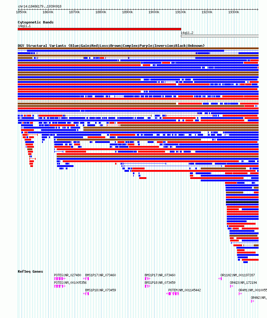 Variant DetailsVariant: nsv1047362| Internal ID | 19136581 | | Landmark | | | Location Information | | | Cytoband | 14q11.1 | | Allele length | | Assembly | Allele length | | hg38 | 1213218 | | hg19 | 904900 | | hg18 | 904740 |