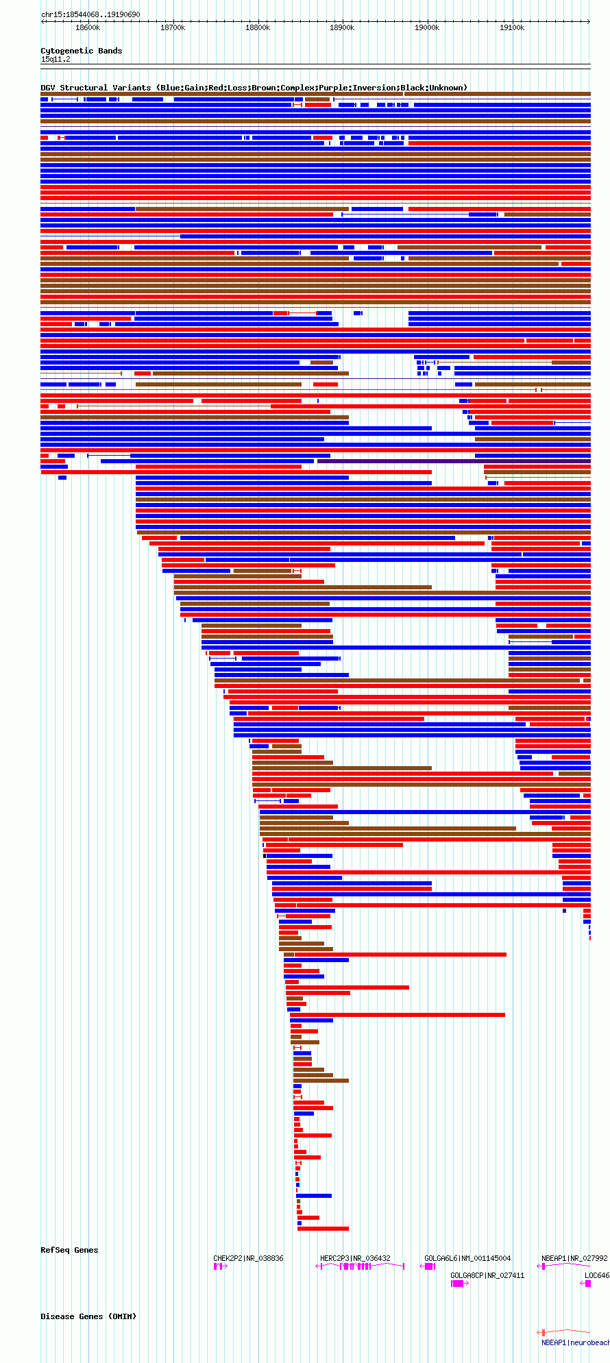 Variant DetailsVariant: nsv1047589| Internal ID | 19136808 | | Landmark | | | Location Information | | | Cytoband | 15q11.1 | | Allele length | | Assembly | Allele length | | hg38 | 610498 | | hg19 | 610574 | | hg18 | 646623 |