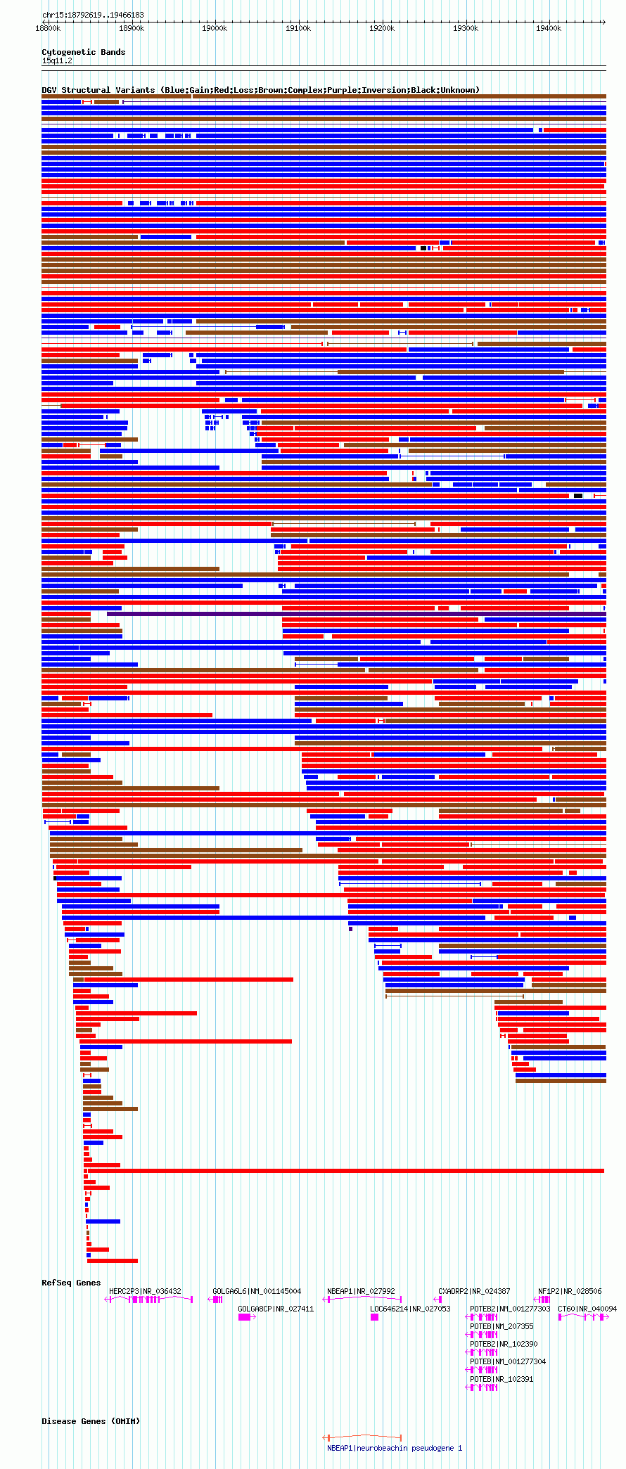 | | Variant Type | CNV gain | | Copy Number | | | Allele State | | | Allele Origin | | | Probe Count | | | Validation Flag | | | Merged Status | M | | Merged Variants | dgv2237n100 | | Supporting Variants | nssv3536182, nssv3713723 | | Samples | | | Known Genes | CT60, CXADRP2, GOLGA6L6, GOLGA8CP, HERC2P3, LOC646214, NBEAP1, NF1P2, POTEB, POTEB2 | | Method | SNP array | | Analysis | Affymetrix SNP array copy number analysis | | Platform | Affymetrix SNP Array 6.0 | | Comments | | | Reference | Coe_et_al_2014 | | Pubmed ID | 25217958 | | Accession Number(s) | nsv1047800