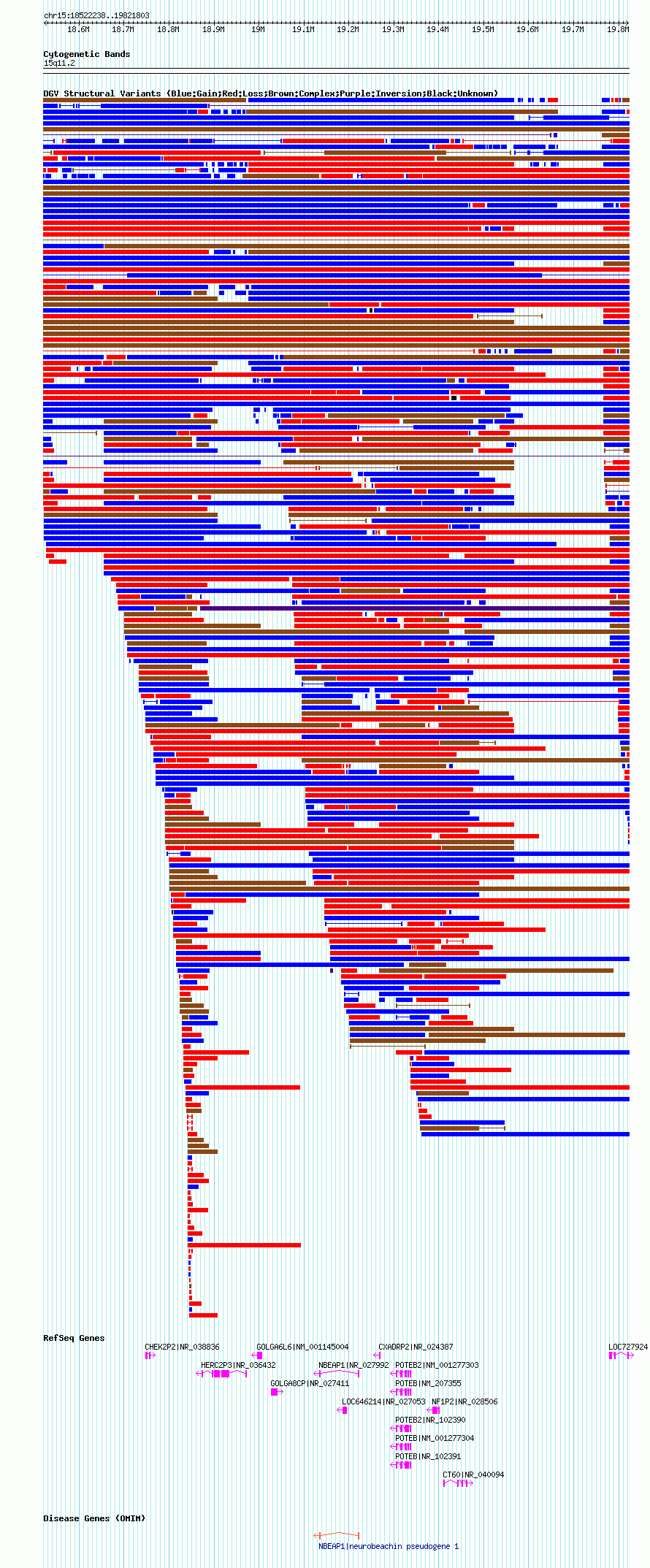 Variant DetailsVariant: nsv1048022| Internal ID | 19137241 | | Landmark | | | Location Information | | | Cytoband | 15q11.1 | | Allele length | | Assembly | Allele length | | hg38 | 1975518 | | hg19 | 2058216 | | hg18 | 1299566 |
