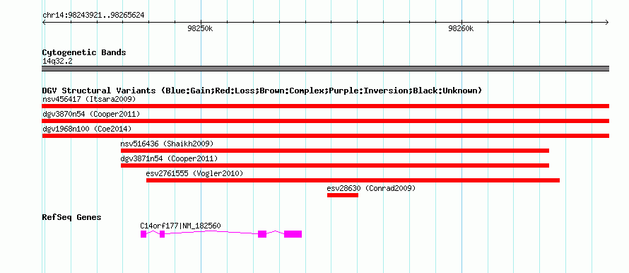 Variant DetailsVariant: nsv1048088| Internal ID | 19137307 | | Landmark | | | Location Information | | | Cytoband | 14q32.2 | | Allele length | | Assembly | Allele length | | hg38 | 21704 | | hg19 | 21704 | | hg18 | 21704 |