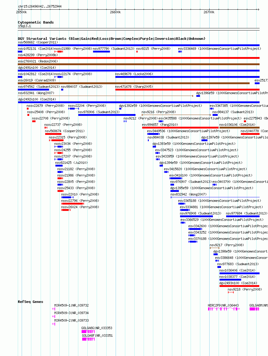 | | Variant Type | CNV gain | | Copy Number | | | Allele State | | | Allele Origin | | | Probe Count | | | Validation Flag | | | Merged Status | M | | Merged Variants | dgv2492n100 | | Supporting Variants | nssv3721473 | | Samples | | | Known Genes | GOLGA8F, GOLGA8G, GOLGA8M, HERC2P9, MIR4509-1, MIR4509-2, MIR4509-3 | | Method | SNP array | | Analysis | Affymetrix SNP array copy number analysis | | Platform | Affymetrix SNP Array 6.0 | | Comments | | | Reference | Coe_et_al_2014 | | Pubmed ID | 25217958 | | Accession Number(s) | nsv1048161
