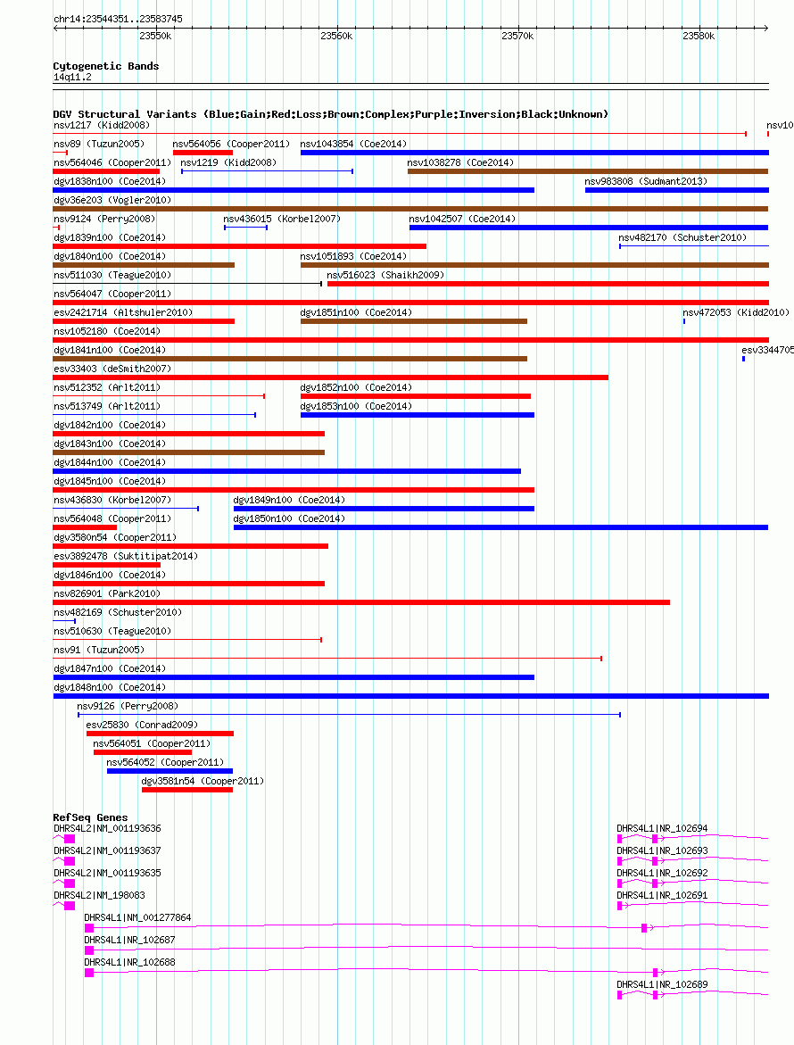 Variant DetailsVariant: nsv1048292| Internal ID | 19137511 | | Landmark | | | Location Information | | | Cytoband | 14q11.2 | | Allele length | | Assembly | Allele length | | hg38 | 39395 | | hg19 | 39395 | | hg18 | 39395 |