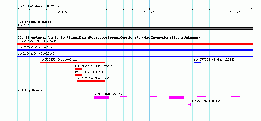 | | Variant Type | CNV gain | | Copy Number | | | Allele State | | | Allele Origin | | | Probe Count | | | Validation Flag | | | Merged Status | M | | Merged Variants | dgv2649n100 | | Supporting Variants | nssv3555084 | | Samples | | | Known Genes | KLHL25, MIR1276 | | Method | SNP array | | Analysis | Affymetrix SNP array copy number analysis | | Platform | Affymetrix SNP Array 6.0 | | Comments | | | Reference | Coe_et_al_2014 | | Pubmed ID | 25217958 | | Accession Number(s) | nsv1048430