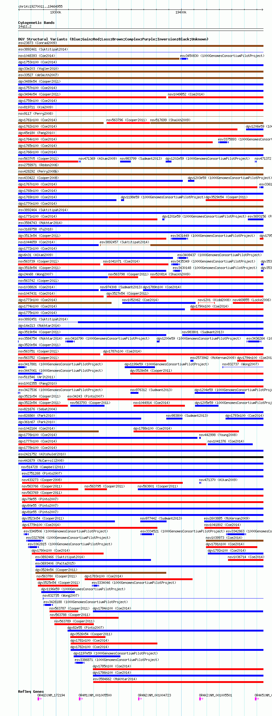 Variant DetailsVariant: nsv1048927| Internal ID | 19138146 | | Landmark | | | Location Information | | | Cytoband | 14q11.2 | | Allele length | | Assembly | Allele length | | hg38 | 194945 | | hg19 | 194945 | | hg18 | 194945 |