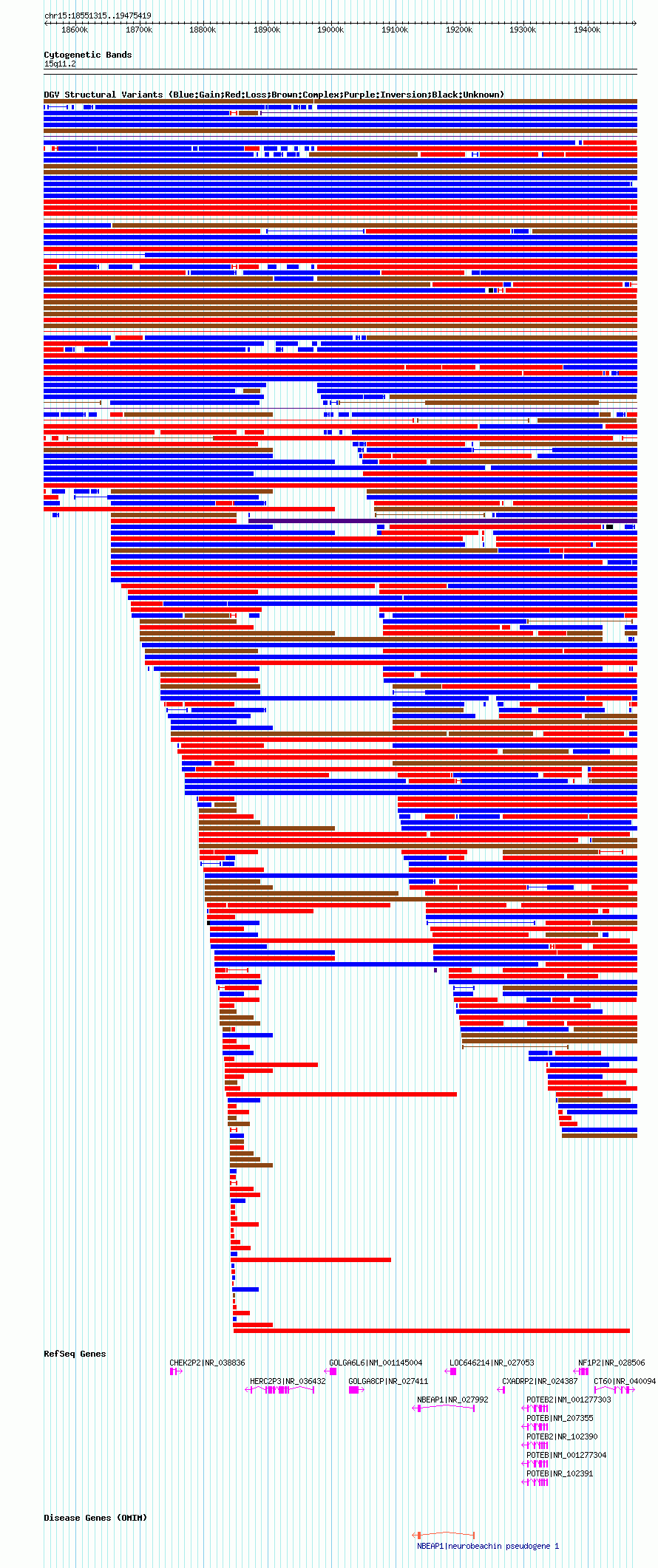 | | Variant Type | CNV gain | | Copy Number | | | Allele State | | | Allele Origin | | | Probe Count | | | Validation Flag | | | Merged Status | M | | Merged Variants | dgv2182n100 | | Supporting Variants | nssv3537919, nssv3537920 | | Samples | | | Known Genes | CHEK2P2, CT60, CXADRP2, GOLGA6L6, GOLGA8CP, HERC2P3, LOC646214, NBEAP1, NF1P2, POTEB, POTEB2 | | Method | SNP array | | Analysis | Affymetrix SNP array copy number analysis | | Platform | Affymetrix SNP Array 6.0 | | Comments | | | Reference | Coe_et_al_2014 | | Pubmed ID | 25217958 | | Accession Number(s) | nsv1048994