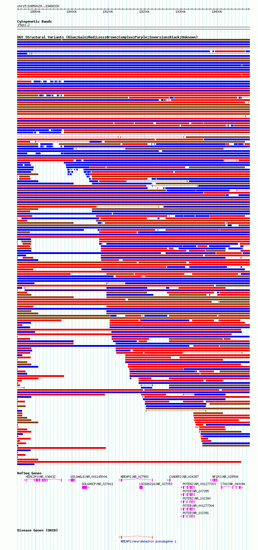 | | Variant Type | CNV gain | | Copy Number | | | Allele State | | | Allele Origin | | | Probe Count | | | Validation Flag | | | Merged Status | M | | Merged Variants | dgv2237n100 | | Supporting Variants | nssv3539566 | | Samples | | | Known Genes | CT60, CXADRP2, GOLGA6L6, GOLGA8CP, HERC2P3, LOC646214, NBEAP1, NF1P2, POTEB, POTEB2 | | Method | SNP array | | Analysis | Affymetrix SNP array copy number analysis | | Platform | Affymetrix SNP Array 6.0 | | Comments | | | Reference | Coe_et_al_2014 | | Pubmed ID | 25217958 | | Accession Number(s) | nsv1049036