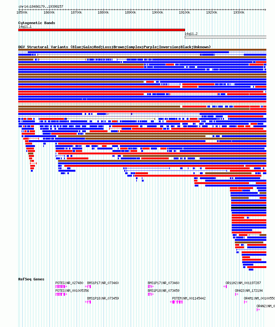 Variant DetailsVariant: nsv1049040| Internal ID | 19138259 | | Landmark | | | Location Information | | | Cytoband | 14q11.1 | | Allele length | | Assembly | Allele length | | hg38 | 1220457 | | hg19 | 912139 | | hg18 | 911979 |