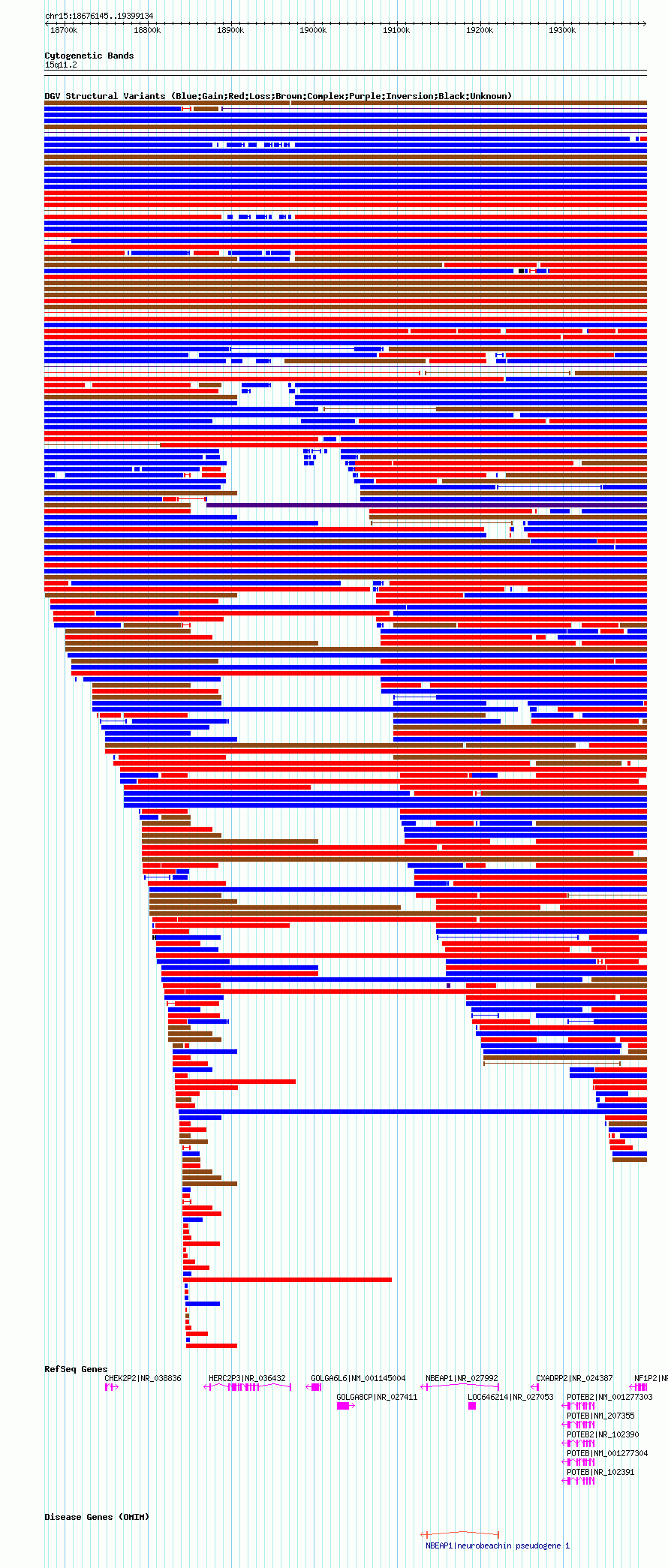 | | Variant Type | CNV loss | | Copy Number | | | Allele State | | | Allele Origin | | | Probe Count | | | Validation Flag | | | Merged Status | M | | Merged Variants | dgv2211n100 | | Supporting Variants | nssv3538216 | | Samples | | | Known Genes | CHEK2P2, CXADRP2, GOLGA6L6, GOLGA8CP, HERC2P3, LOC646214, NBEAP1, NF1P2, POTEB, POTEB2 | | Method | SNP array | | Analysis | Affymetrix SNP array copy number analysis | | Platform | Affymetrix SNP Array 6.0 | | Comments | | | Reference | Coe_et_al_2014 | | Pubmed ID | 25217958 | | Accession Number(s) | nsv1049109