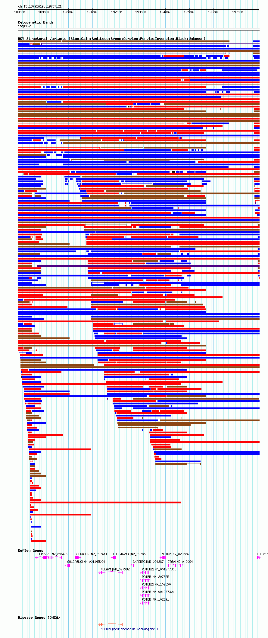 Variant DetailsVariant: nsv1049110| Internal ID | 19138329 | | Landmark | | | Location Information | | | Cytoband | 15q11.1 | | Allele length | | Assembly | Allele length | | hg38 | 1670455 | | hg19 | 1753153 | | hg18 | 994503 |
