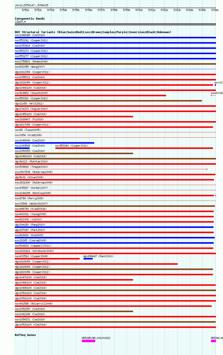 Variant DetailsVariant: nsv1049174| Internal ID | 19138393 | | Landmark | | | Location Information | | | Cytoband | 11p15.4 | | Allele length | | Assembly | Allele length | | hg38 | 15879 | | hg19 | 15879 | | hg18 | 15879 |