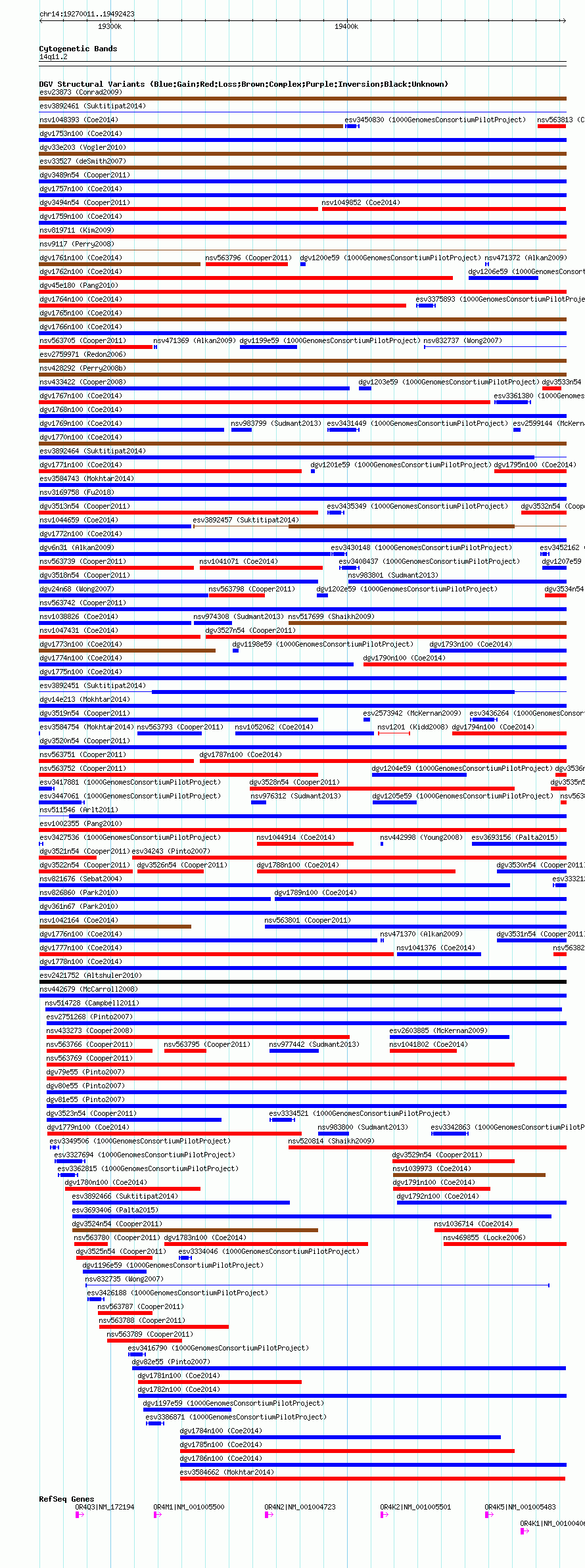 Variant DetailsVariant: nsv1049233 | Internal ID | 19138452 | | Landmark | | | Location Information | | | Cytoband | 14q11.2 | | Allele length | | Assembly | Allele length | | hg38 | 222413 | | hg19 | 222413 | | hg18 | 222413 |