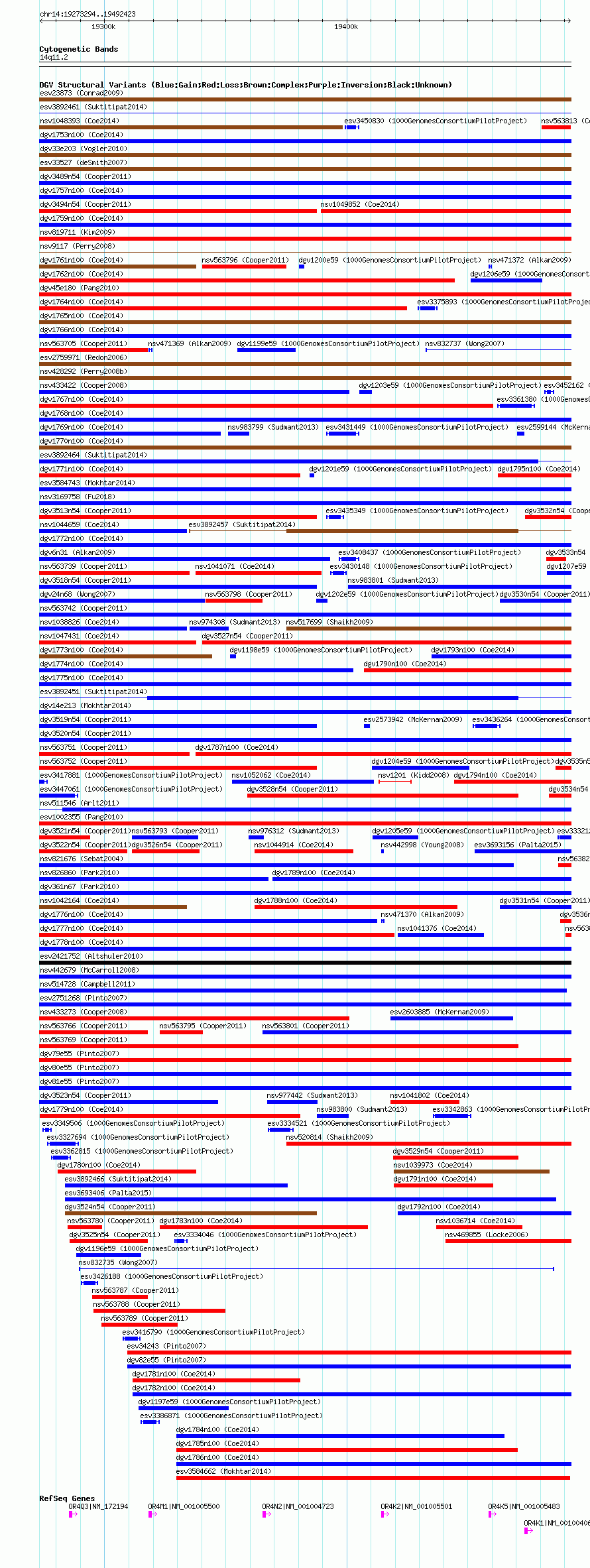 Variant DetailsVariant: nsv1049290| Internal ID | 19138509 | | Landmark | | | Location Information | | | Cytoband | 14q11.2 | | Allele length | | Assembly | Allele length | | hg38 | 219130 | | hg19 | 219130 | | hg18 | 219130 |