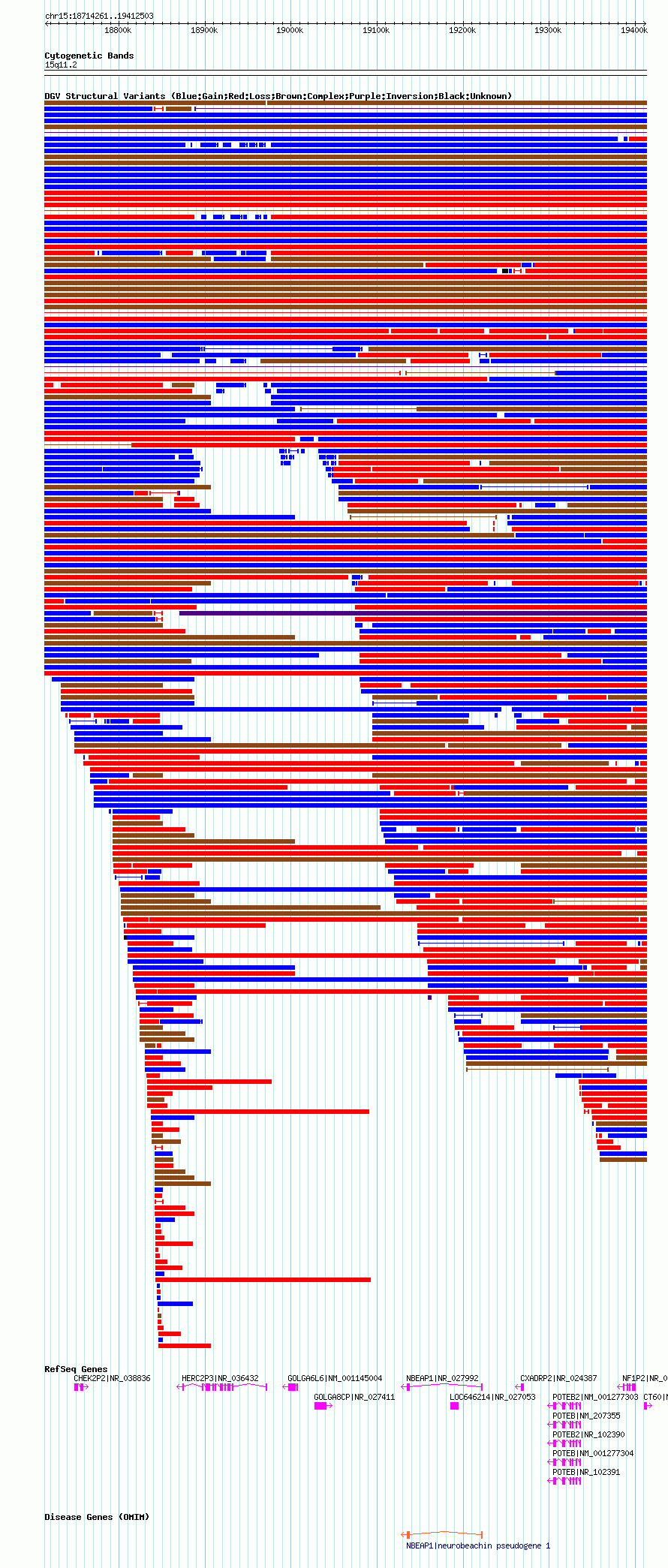 Variant DetailsVariant: nsv1049351| Internal ID | 19138570 | | Landmark | | | Location Information | | | Cytoband | 15q11.1 | | Allele length | | Assembly | Allele length | | hg38 | 693522 | | hg19 | 693598 | | hg18 | 698243 |