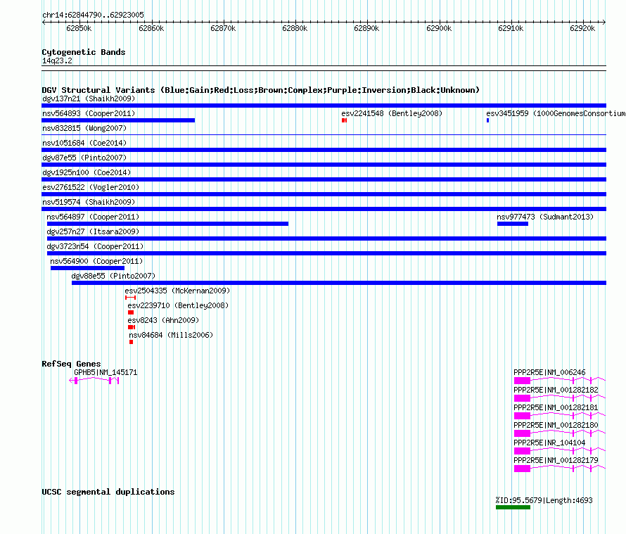 | | Variant Type | CNV gain | | Copy Number | | | Allele State | | | Allele Origin | | | Probe Count | | | Validation Flag | | | Merged Status | M | | Merged Variants | dgv1925n100 | | Supporting Variants | nssv3531058 | | Samples | | | Known Genes | GPHB5, PPP2R5E | | Method | SNP array | | Analysis | Affymetrix SNP array copy number analysis | | Platform | Affymetrix SNP Array 6.0 | | Comments | | | Reference | Coe_et_al_2014 | | Pubmed ID | 25217958 | | Accession Number(s) | nsv1049419