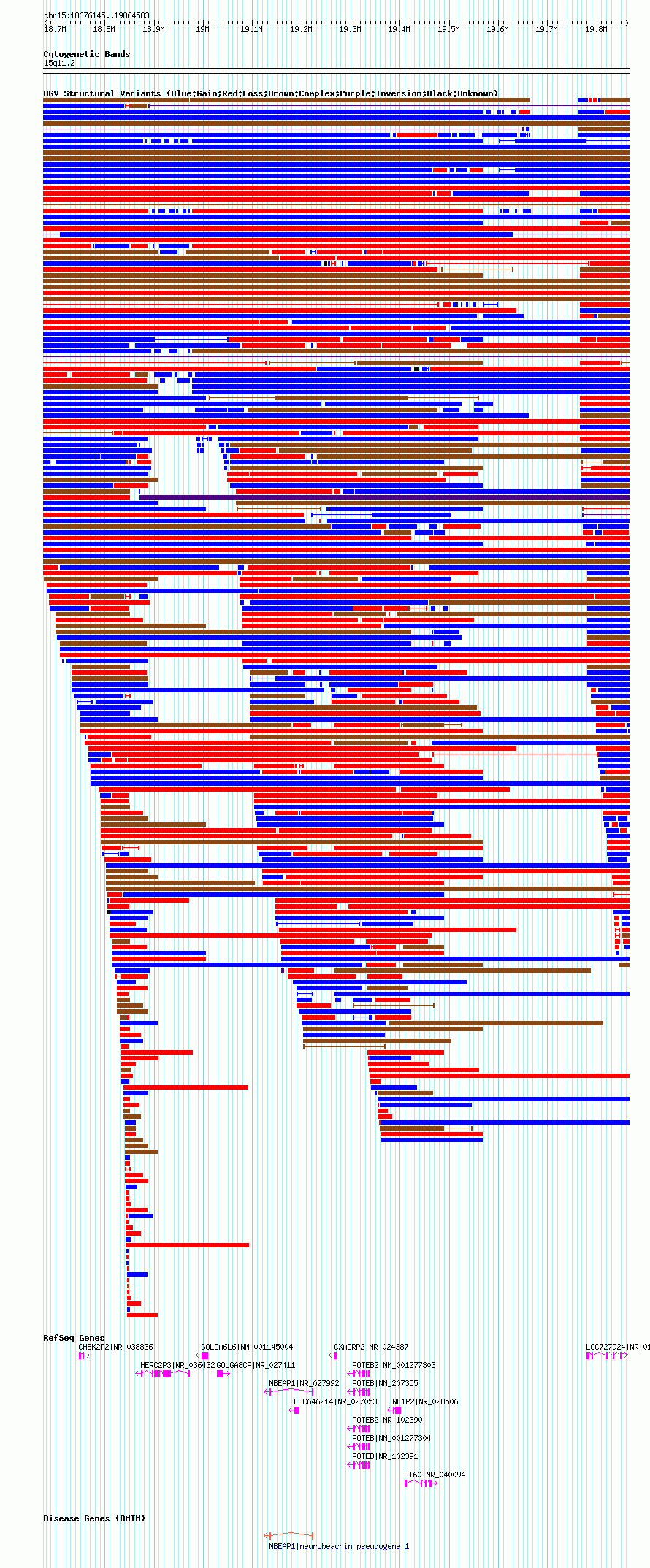 Variant DetailsVariant: nsv1049546| Internal ID | 19138765 | | Landmark | | | Location Information | | | Cytoband | 15q11.1 | | Allele length | | Assembly | Allele length | | hg38 | 1864391 | | hg19 | 1947089 | | hg18 | 1188439 |