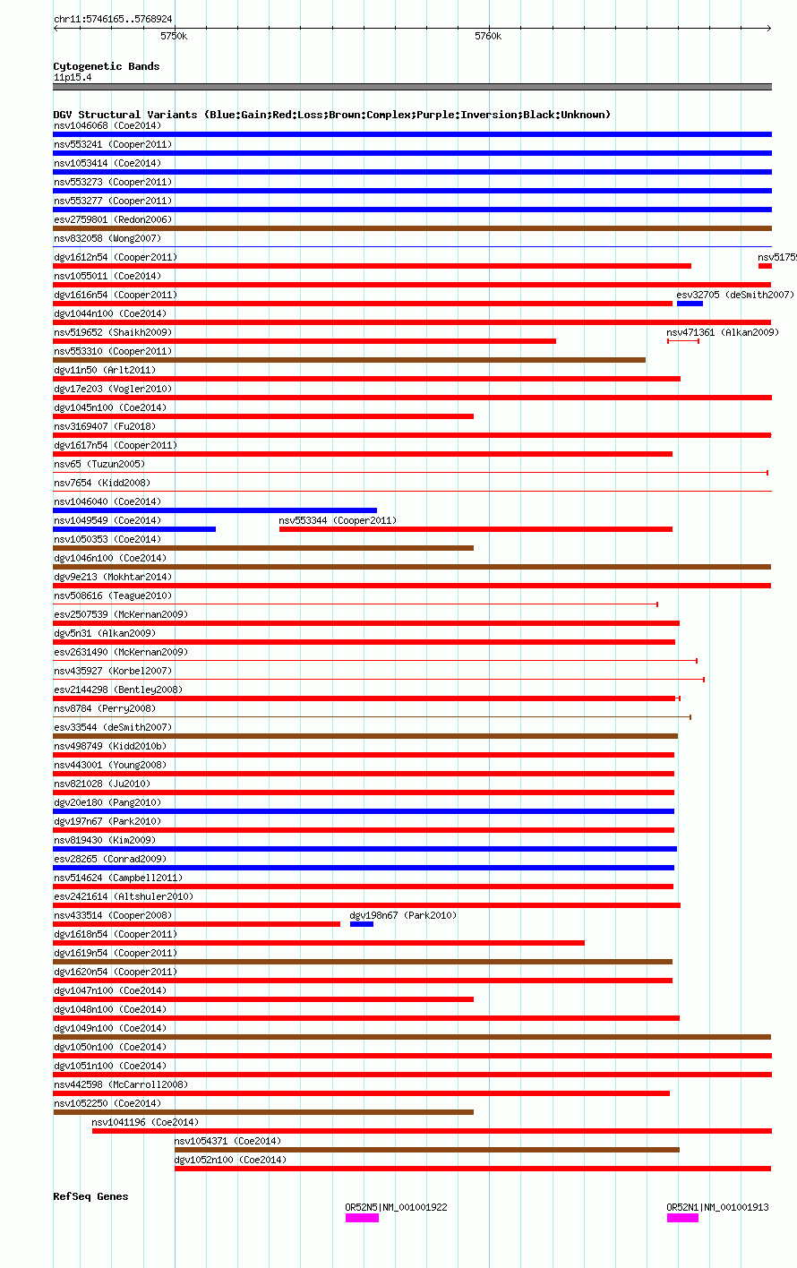 Variant DetailsVariant: nsv1049814| Internal ID | 19139033 | | Landmark | | | Location Information | | | Cytoband | 11p15.4 | | Allele length | | Assembly | Allele length | | hg38 | 22760 | | hg19 | 22760 | | hg18 | 22760 |