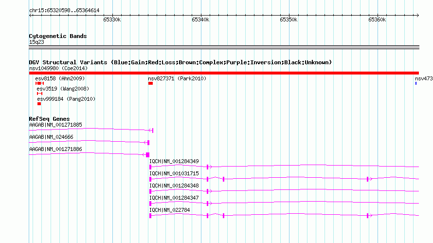 Variant DetailsVariant: nsv1049980| Internal ID | 19139199 | | Landmark | | | Location Information | | | Cytoband | 15q23 | | Allele length | | Assembly | Allele length | | hg38 | 44017 | | hg19 | 44017 | | hg18 | 44017 |