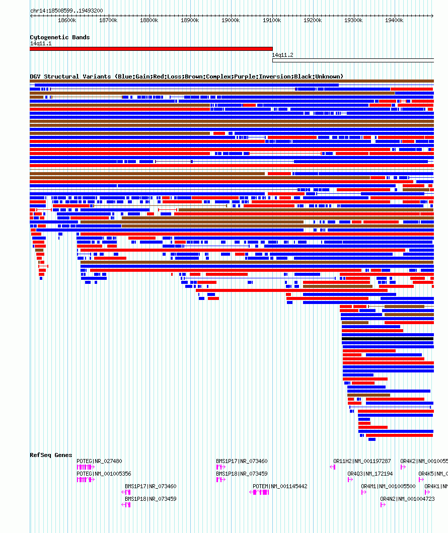 Variant DetailsVariant: nsv1049987| Internal ID | 19139206 | | Landmark | | | Location Information | | | Cytoband | 14q11.1 | | Allele length | | Assembly | Allele length | | hg38 | 1293080 | | hg19 | 984762 | | hg18 | 984602 |