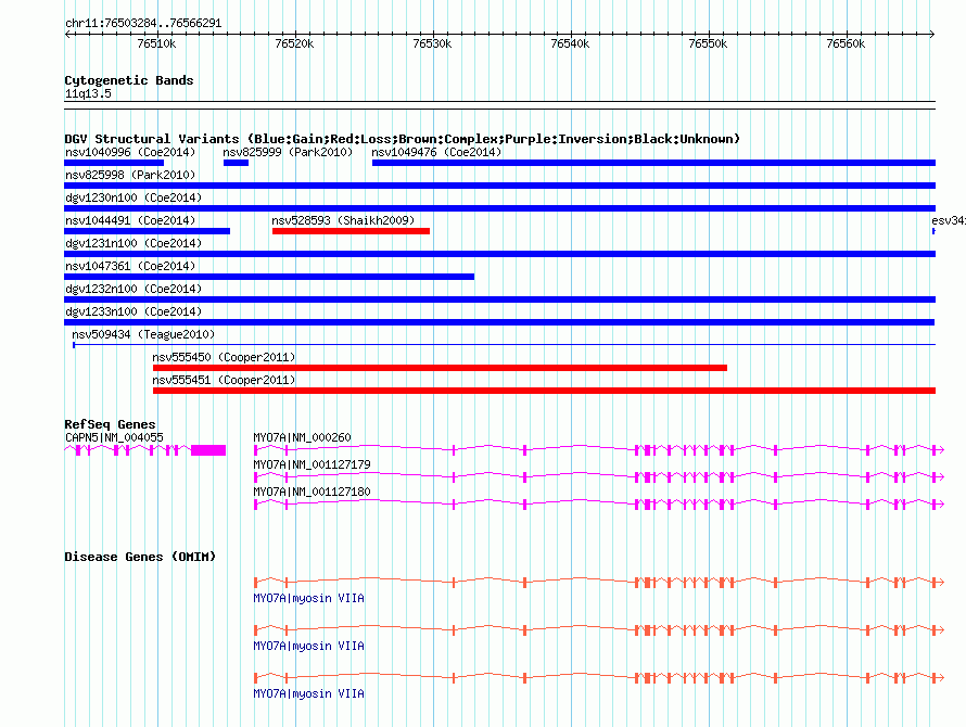 | | Variant Type | CNV gain | | Copy Number | | | Allele State | | | Allele Origin | | | Probe Count | | | Validation Flag | | | Merged Status | M | | Merged Variants | dgv1233n100 | | Supporting Variants | nssv3519289 | | Samples | | | Known Genes | CAPN5, MYO7A | | Method | SNP array | | Analysis | Affymetrix SNP array copy number analysis | | Platform | Affymetrix SNP Array 6.0 | | Comments | | | Reference | Coe_et_al_2014 | | Pubmed ID | 25217958 | | Accession Number(s) | nsv1049996