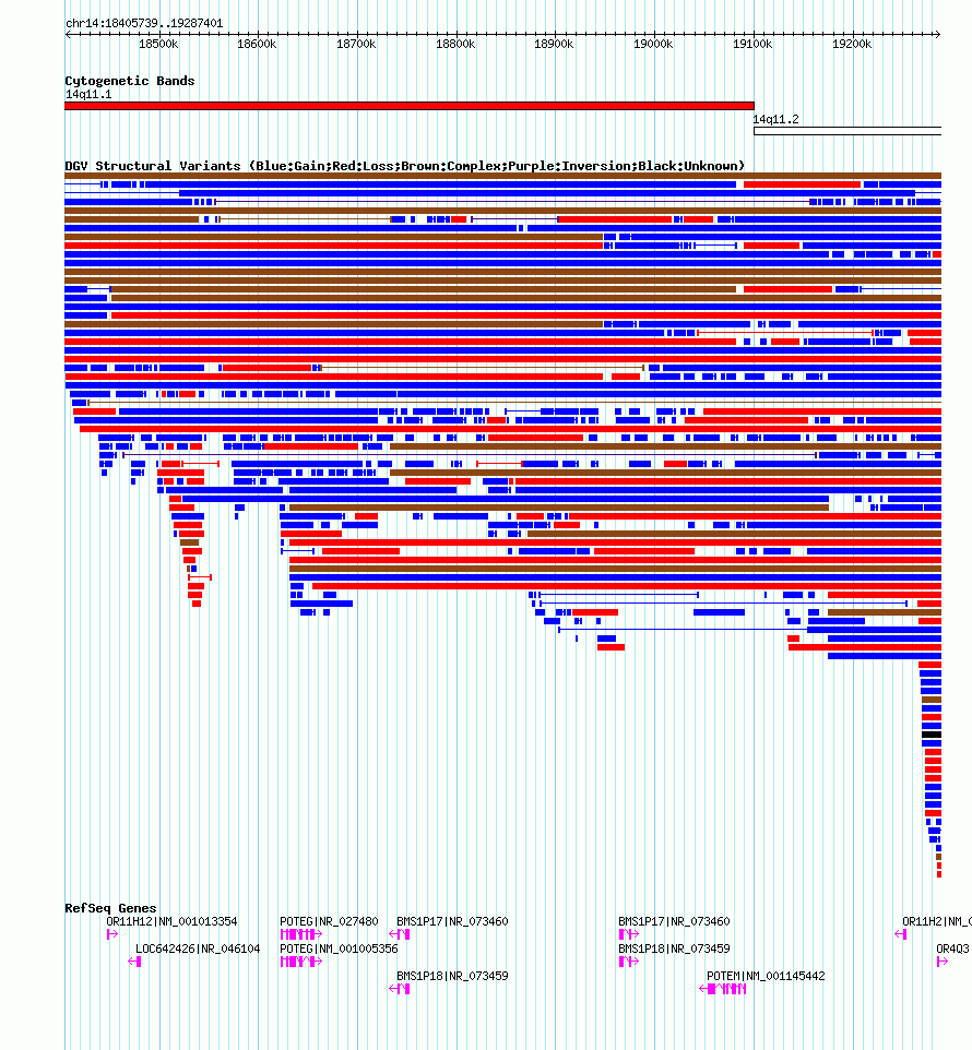 Variant DetailsVariant: nsv1050003| Internal ID | 19139222 | | Landmark | | | Location Information | | | Cytoband | 14q11.1 | | Allele length | | Assembly | Allele length | | hg38 | 1190141 | | hg19 | 881823 | | hg18 | 881663 |