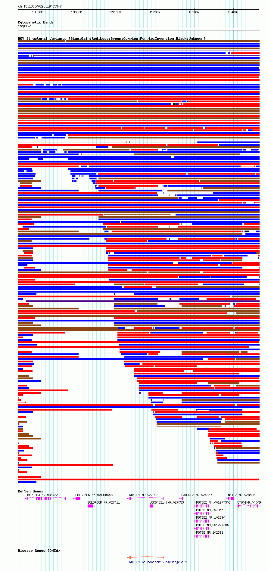 Variant DetailsVariant: nsv1050046| Internal ID | 19139265 | | Landmark | | | Location Information | | | Cytoband | 15q11.1 | | Allele length | | Assembly | Allele length | | hg38 | 610598 | | hg19 | 610674 | | hg18 | 615319 |