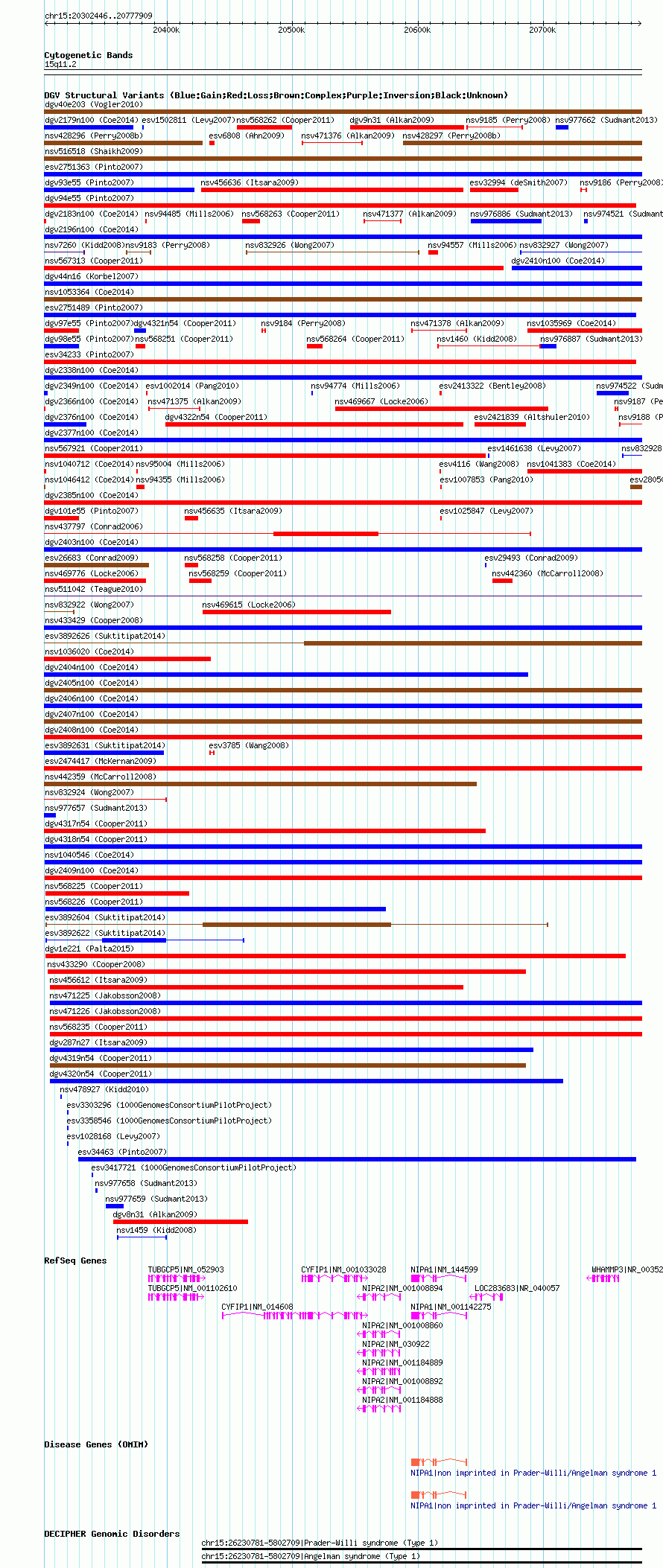 Variant DetailsVariant: nsv1050262| Internal ID | 19139481 | | Landmark | | | Location Information | | | Cytoband | 15q11.2 | | Allele length | | Assembly | Allele length | | hg38 | 475359 | | hg19 | 475387 | | hg18 | 475464 |