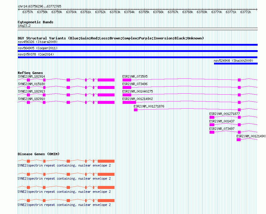 | | Variant Type | CNV gain | | Copy Number | | | Allele State | | | Allele Origin | | | Probe Count | | | Validation Flag | | | Merged Status | M | | Merged Variants | | | Supporting Variants | nssv3531079 | | Samples | | | Known Genes | ESR2, MIR548AZ, SYNE2 | | Method | SNP array | | Analysis | Affymetrix SNP array copy number analysis | | Platform | Affymetrix SNP Array 6.0 | | Comments | | | Reference | Coe_et_al_2014 | | Pubmed ID | 25217958 | | Accession Number(s) | nsv1050378