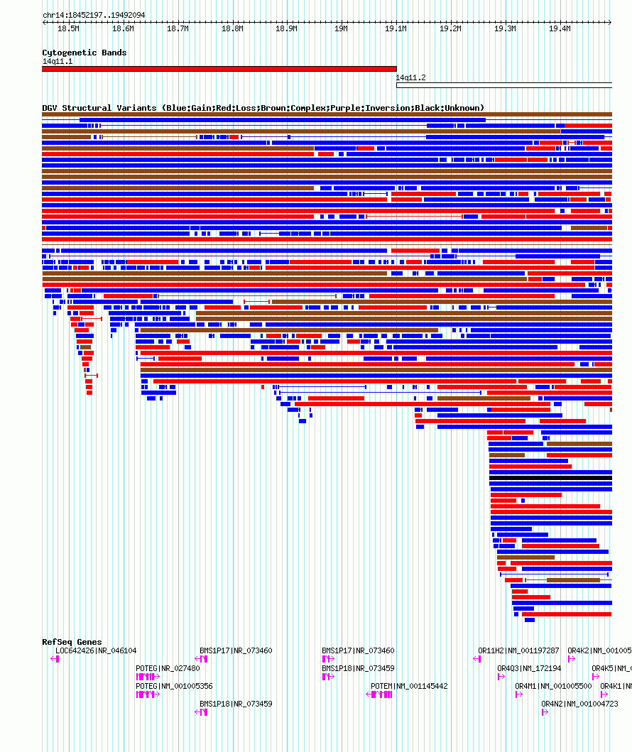 Variant DetailsVariant: nsv1050389| Internal ID | 19139608 | | Landmark | | | Location Information | | | Cytoband | 14q11.1 | | Allele length | | Assembly | Allele length | | hg38 | 1348376 | | hg19 | 1040058 | | hg18 | 1039898 |