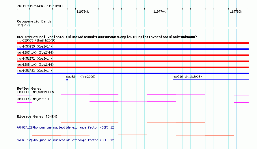 | | Variant Type | CNV loss | | Copy Number | | | Allele State | | | Allele Origin | | | Probe Count | | | Validation Flag | | | Merged Status | M | | Merged Variants | dgv1288n100 | | Supporting Variants | nssv3518704, nssv3504148 | | Samples | | | Known Genes | ARHGEF12 | | Method | SNP array | | Analysis | Affymetrix SNP array copy number analysis | | Platform | Affymetrix SNP Array 6.0 | | Comments | | | Reference | Coe_et_al_2014 | | Pubmed ID | 25217958 | | Accession Number(s) | nsv1050709
