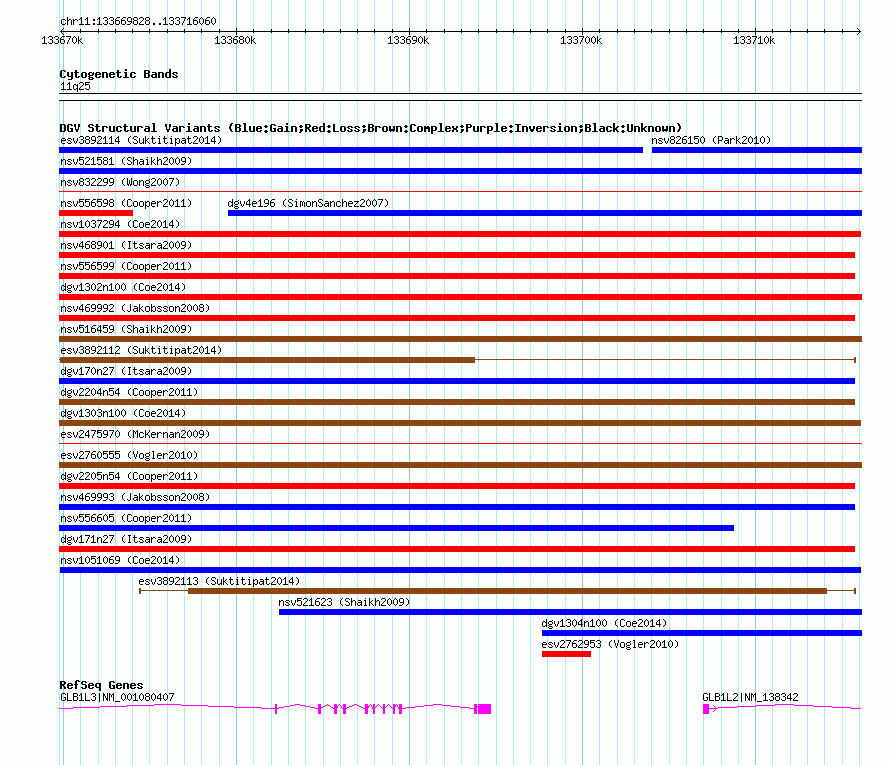 Variant DetailsVariant: nsv1051069| Internal ID | 18793600 | | Landmark | | | Location Information | | | Cytoband | 11q25 | | Allele length | | Assembly | Allele length | | hg38 | 46233 | | hg19 | 46233 | | hg18 | 46233 |