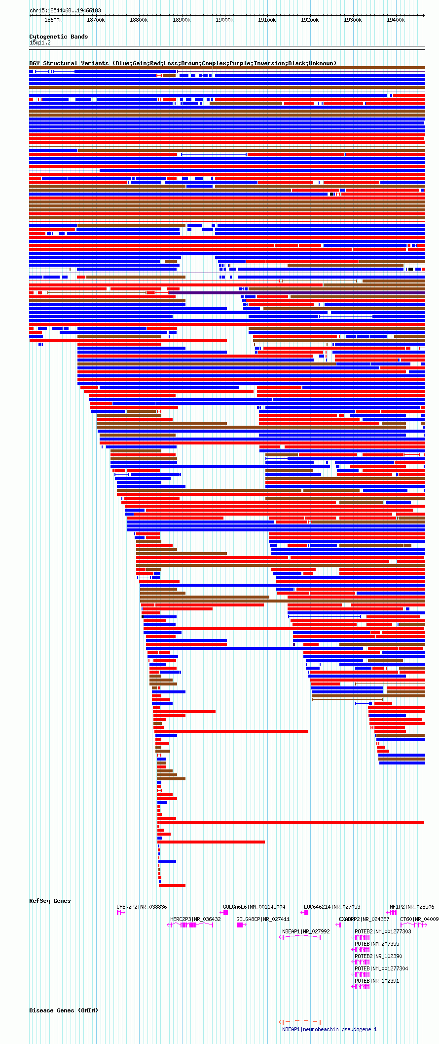 Variant DetailsVariant: nsv1051174| Internal ID | 19140393 | | Landmark | | | Location Information | | | Cytoband | 15q11.1 | | Allele length | | Assembly | Allele length | | hg38 | 917395 | | hg19 | 917471 | | hg18 | 922116 |
