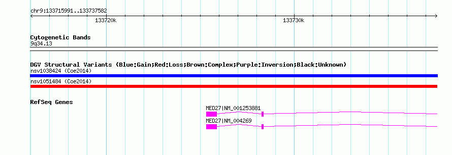 | | Variant Type | CNV loss | | Copy Number | | | Allele State | | | Allele Origin | | | Probe Count | | | Validation Flag | | | Merged Status | M | | Merged Variants | | | Supporting Variants | nssv3695291, nssv3695290 | | Samples | | | Known Genes | MED27 | | Method | SNP array | | Analysis | Affymetrix SNP array copy number analysis | | Platform | Affymetrix SNP Array 6.0 | | Comments | | | Reference | Coe_et_al_2014 | | Pubmed ID | 25217958 | | Accession Number(s) | nsv1051484