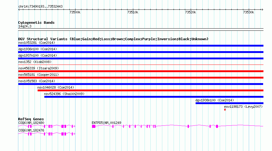 Variant DetailsVariant: nsv1051583| Internal ID | 19140802 | | Landmark | | | Location Information | | | Cytoband | 14q24.3 | | Allele length | | Assembly | Allele length | | hg38 | 42251 | | hg19 | 42251 | | hg18 | 42251 |