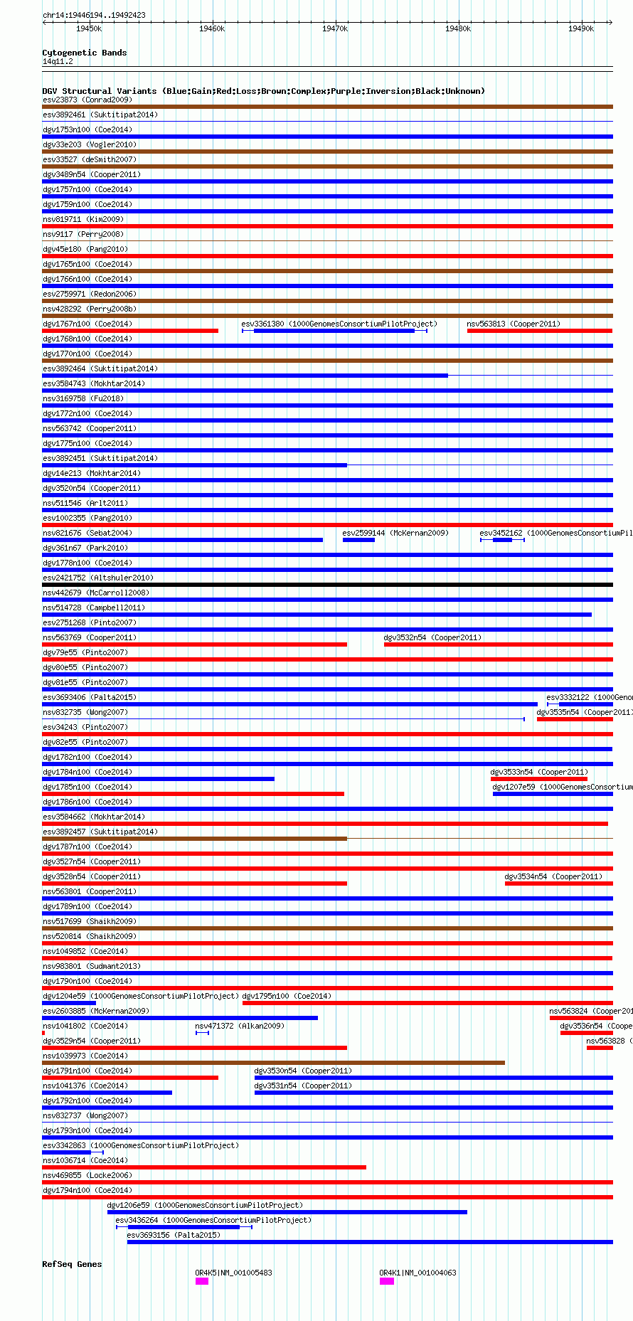 Variant DetailsVariant: nsv1051708| Internal ID | 19140927 | | Landmark | | | Location Information | | | Cytoband | 14q11.2 | | Allele length | | Assembly | Allele length | | hg38 | 46230 | | hg19 | 46230 | | hg18 | 46230 |