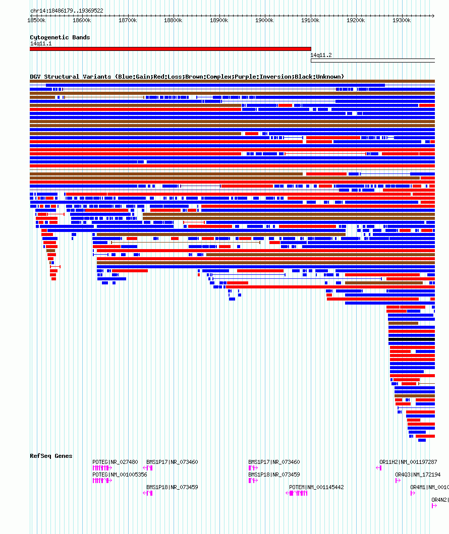Variant DetailsVariant: nsv1051849| Internal ID | 19141068 | | Landmark | | | Location Information | | | Cytoband | 14q11.1 | | Allele length | | Assembly | Allele length | | hg38 | 1191822 | | hg19 | 883504 | | hg18 | 883344 |