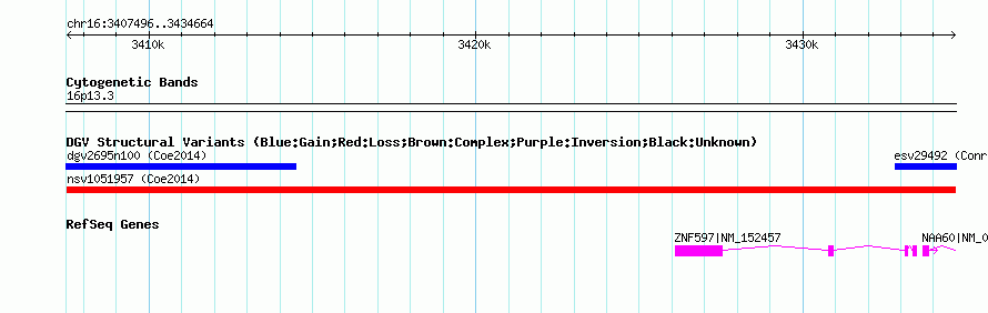 | Variant Type | CNV loss | Copy Number | | Allele State | | Allele Origin | | Probe Count | | Validation Flag | | Merged Status | M | Merged Variants | | Supporting Variants | nssv3556967 | Samples | | Known Genes | NAA60, ZNF597 | Method | SNP array | Analysis | Affymetrix SNP array copy number analysis | Platform | Affymetrix SNP Array 6.0 | Comments | | Reference | Coe_et_al_2014 | Pubmed ID | 25217958 | Accession Number(s) | nsv1051957