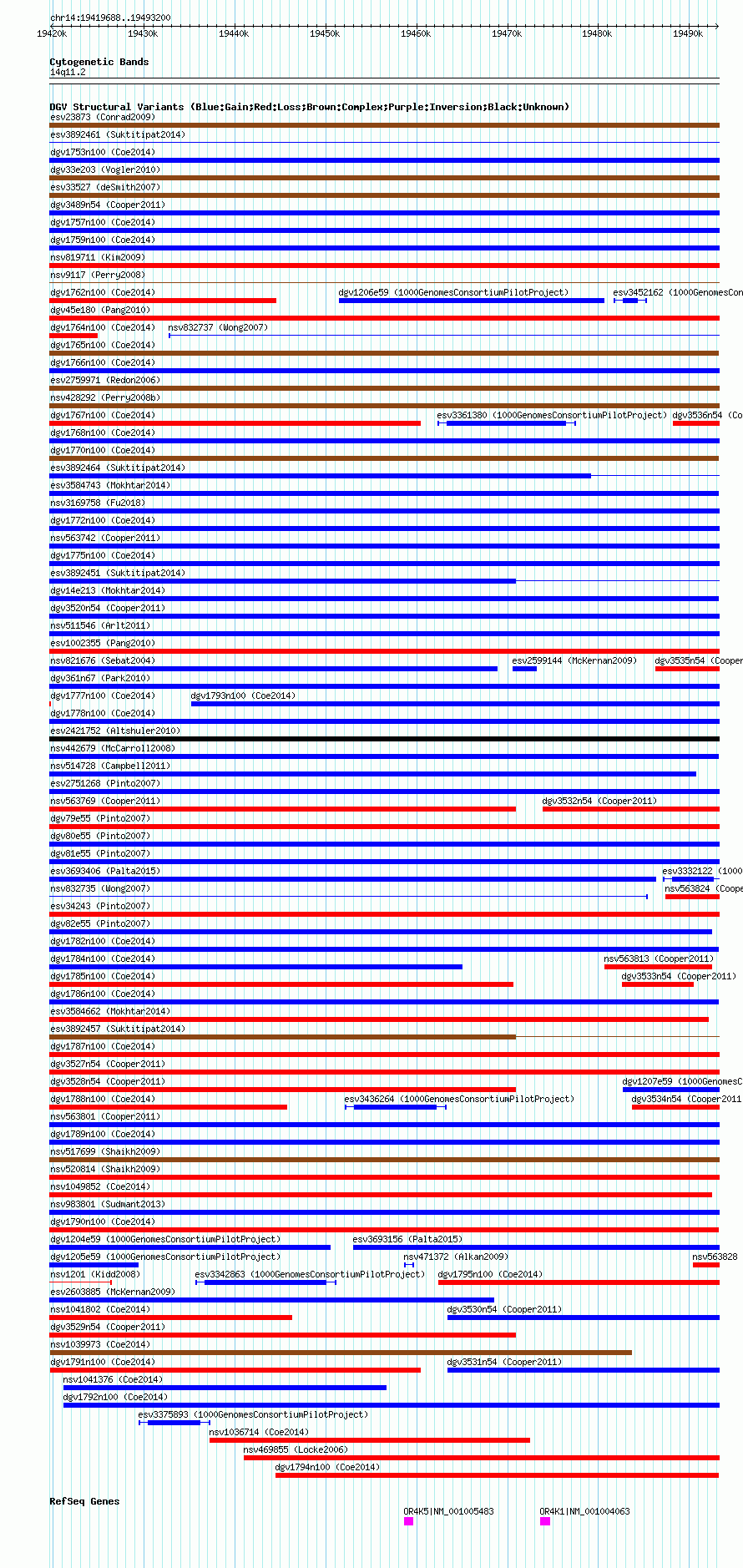 Variant DetailsVariant: nsv1052037| Internal ID | 19141256 | | Landmark | | | Location Information | | | Cytoband | 14q11.2 | | Allele length | | Assembly | Allele length | | hg38 | 73513 | | hg19 | 73513 | | hg18 | 73513 |