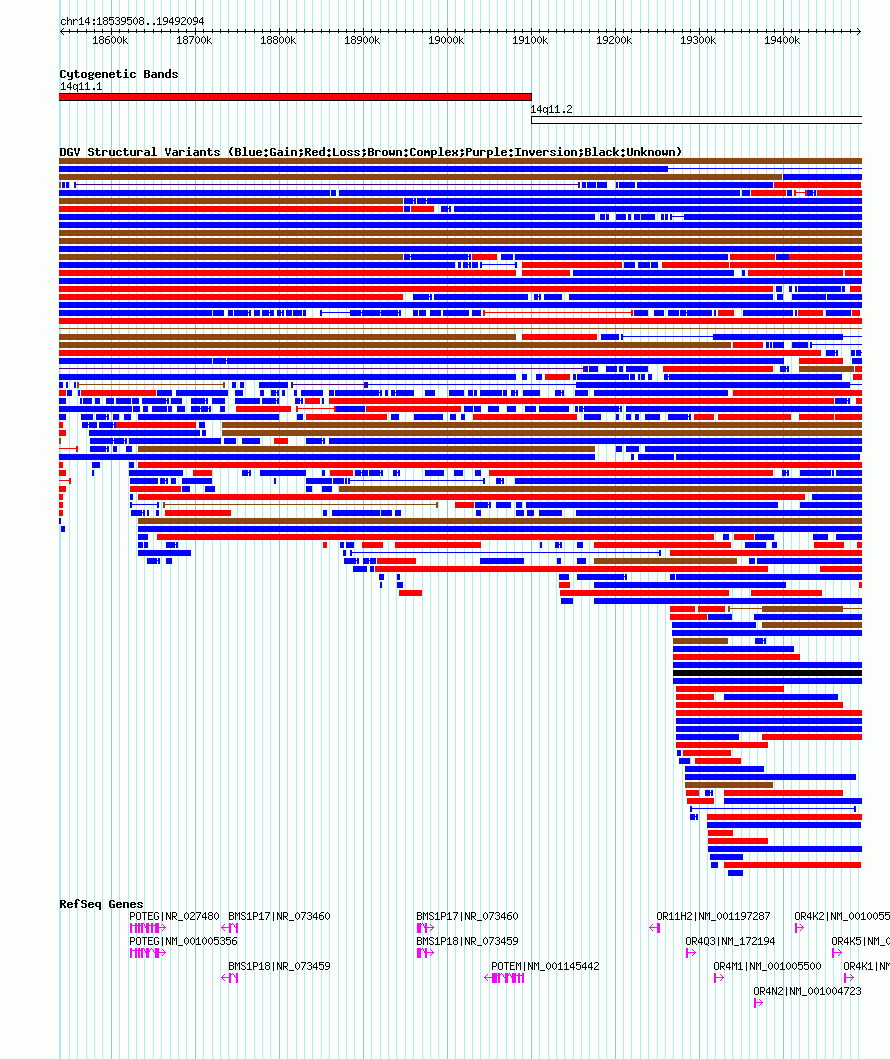 Variant DetailsVariant: nsv1052045| Internal ID | 19141264 | | Landmark | | | Location Information | | | Cytoband | 14q11.1 | | Allele length | | Assembly | Allele length | | hg38 | 1261065 | | hg19 | 952747 | | hg18 | 952587 |