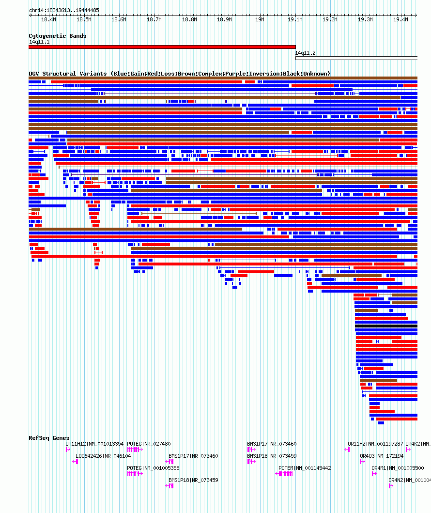 Variant DetailsVariant: nsv1052084| Internal ID | 19141303 | | Landmark | | | Location Information | | | Cytoband | 14q11.1 | | Allele length | | Assembly | Allele length | | hg38 | 1409351 | | hg19 | 1101033 | | hg18 | 1100873 |