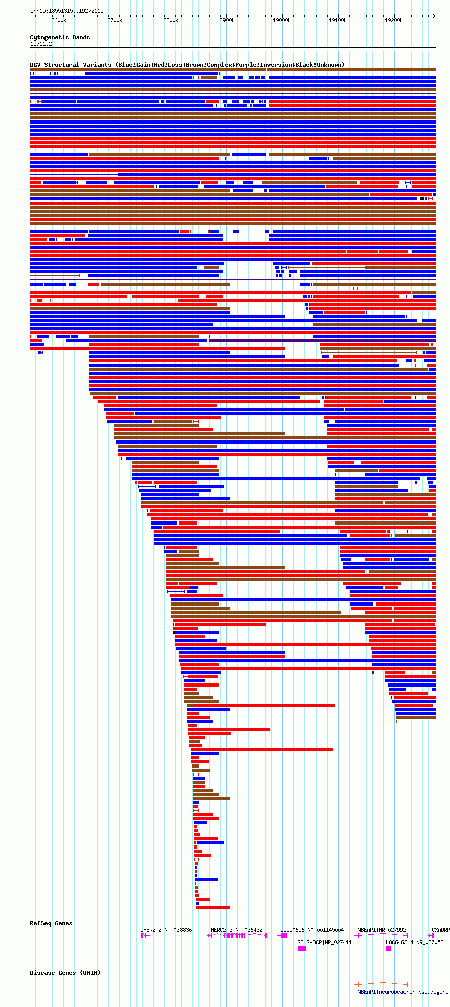 Variant DetailsVariant: nsv1052164| Internal ID | 19141383 | | Landmark | | | Location Information | | | Cytoband | 15q11.1 | | Allele length | | Assembly | Allele length | | hg38 | 720699 | | hg19 | 720775 | | hg18 | 720801 |