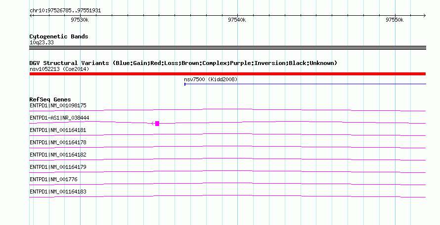 | | Variant Type | CNV loss | | Copy Number | | | Allele State | | | Allele Origin | | | Probe Count | | | Validation Flag | | | Merged Status | M | | Merged Variants | | | Supporting Variants | nssv3519046 | | Samples | | | Known Genes | ENTPD1, ENTPD1-AS1 | | Method | SNP array | | Analysis | Affymetrix SNP array copy number analysis | | Platform | Affymetrix SNP Array 6.0 | | Comments | | | Reference | Coe_et_al_2014 | | Pubmed ID | 25217958 | | Accession Number(s) | nsv1052213