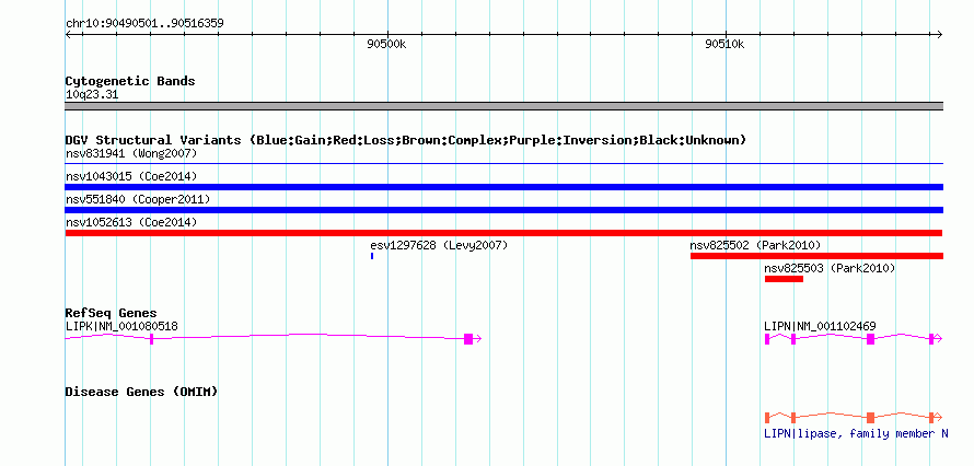 | | Variant Type | CNV loss | | Copy Number | | | Allele State | | | Allele Origin | | | Probe Count | | | Validation Flag | | | Merged Status | M | | Merged Variants | | | Supporting Variants | nssv3515053 | | Samples | | | Known Genes | LIPK, LIPN | | Method | SNP array | | Analysis | Affymetrix SNP array copy number analysis | | Platform | Affymetrix SNP Array 6.0 | | Comments | | | Reference | Coe_et_al_2014 | | Pubmed ID | 25217958 | | Accession Number(s) | nsv1052613